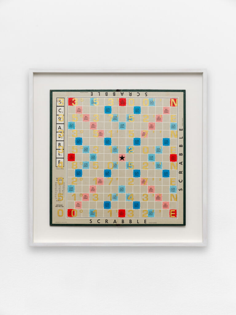 Les coordonnées géographiques des membres de la famille de Stéphanie Saadé (son père, sa mère, elle-même et sa fille, son frère) sont dorées sur la surface d’un plateau de SCRABBLE.